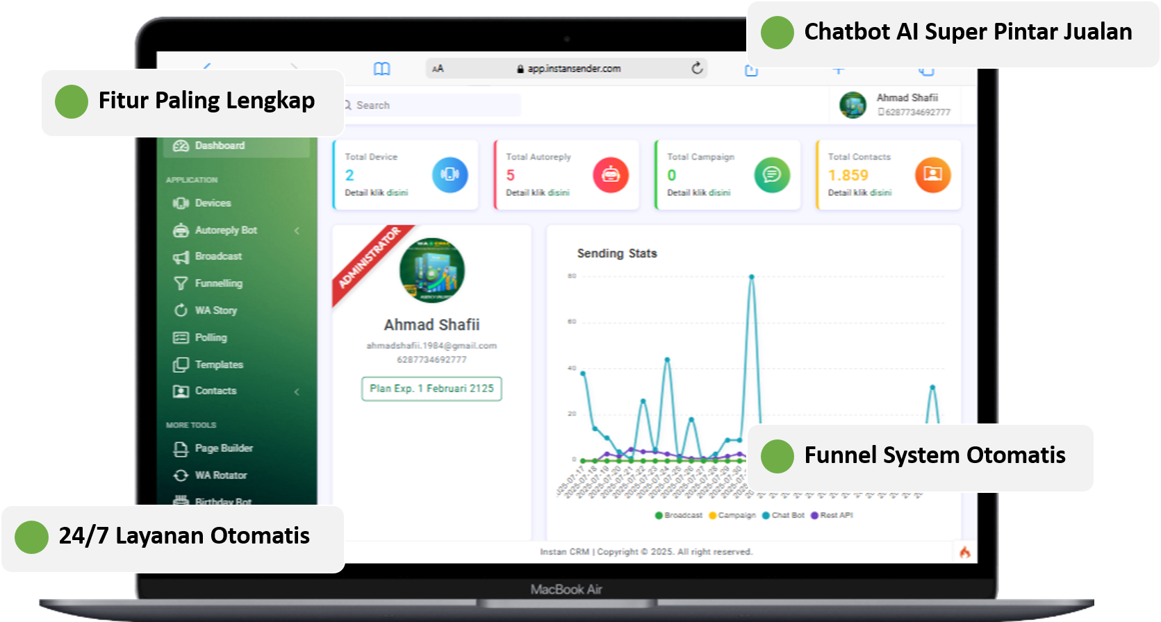 Dengan semua fitur lengkap ini, InstanCRM bukan sekadar alat kirim pesan, tapi senjata ampuh untuk membangun hubungan dengan pelanggan, meningkatkan loyalitas, dan melipatgandakan penjualan bisnis Anda. Kini saatnya berhenti bekerja manual dan biarkan sistem bekerja otomatis untuk Anda. 🚀